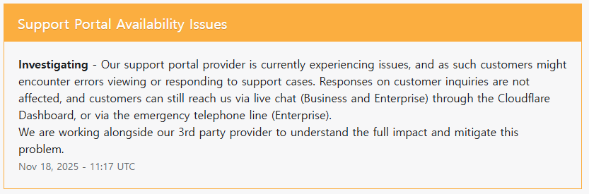 이럴 때 가장 정확한 정보를 얻는 방법은 공식 상태 페이지를 확인하는 거예요. 챗GPT의 문제라기보다 인프라 문제이기 때문에 클라우드플레어의 공식 현황 사이트를 참고하는 것이 가장 빨라요.